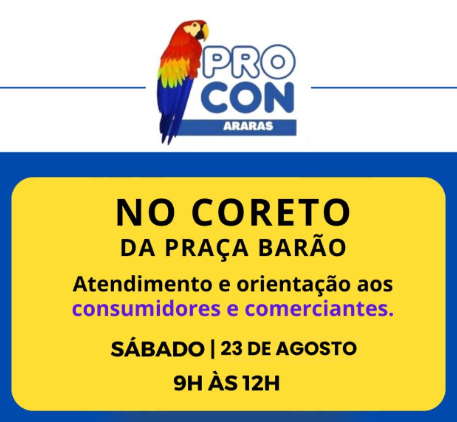 Neste sábado (23), das 9h às 12h, no Coreto da Praça Barão, o Procon (Fundação de Proteção e Defesa do Consumidor) de Araras e o Unar (Centro Universitário Dr. Edmundo Ulson), realizam a quarta edição deste ano do “Procon na Praça”, com atendimento e orientação aos consumidores e comerciantes locais.