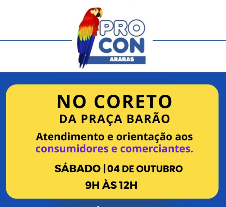 Neste sábado (4), das 9h às 12h, no Coreto da Praça Barão, o Procon (Fundação de Proteção e Defesa do Consumidor) de Araras e o Unar (Centro Universitário Dr. Edmundo Ulson), realizam a 5ª edição deste ano do “Procon na Praça”, com atendimento e orientação aos consumidores e comerciantes locais; a iniciativa tem o apoio da Prefeitura de Araras, por meio da Secretaria Municipal da Justiça.