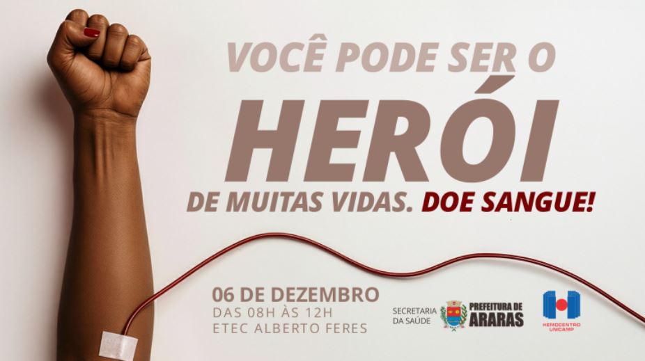 A Prefeitura de Araras, em parceria com o Hemocentro da Unicamp (Universidade Estadual de Campinas), realiza no próximo sábado (6) mais uma Campanha de Doação de Sangue. A ação acontece na ETEC Prefeito Alberto Feres, das 9h às 12h, e as senhas começam a ser distribuídas às 8h.