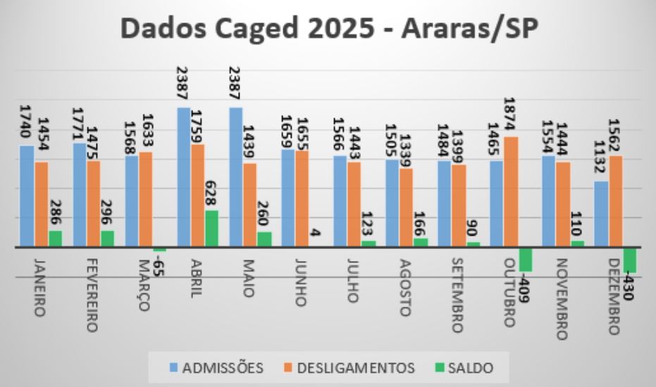 Araras registrou um saldo positivo de 1.082 novos postos de trabalho formais em 2025, segundo dados divulgados na última quinta-feira (29), pelo Novo Caged (Cadastro Geral de Empregados e Desempregados) do Ministério do Trabalho e Emprego. O município contabilizou 19.558 admissões e 18.476 desligamentos.