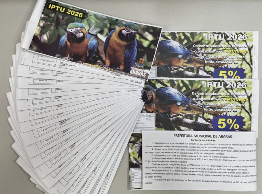 Os boletos do IPTU 2026 já estão disponíveis para pagamento online. Basta acessar https://araras.sp.gov.br/iptu_segunda_via, clicar no ícone da segunda via do IPTU e informar o CPF ou CNPJ do titular do imóvel. Quem tem a opção Débito Direto Autorizado (DDA), ativada nos aplicativos bancários, também já pode fazer o pagamento.