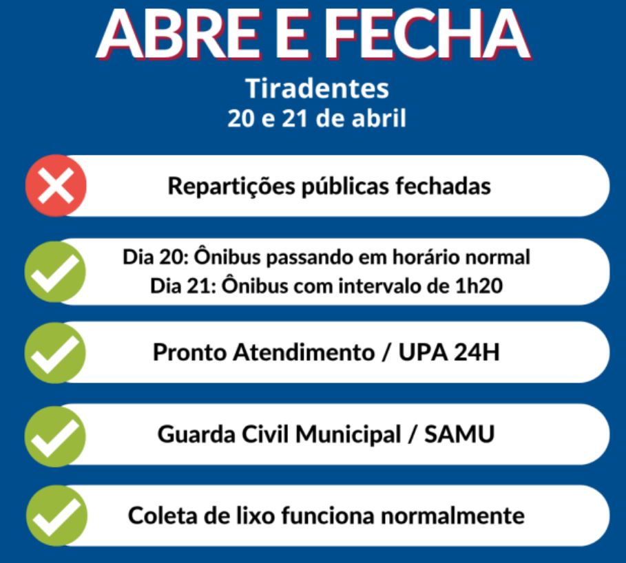 A Prefeitura de Araras informa que devido ao feriado nacional de Tiradentes, no dia 21 de abril, não haverá expediente nas repartições públicas municipais na segunda-feira (20), ponto facultativo, e na terça-feira (21), feriado. As atividades retornam normalmente na quarta-feira (22), a partir das 8h.